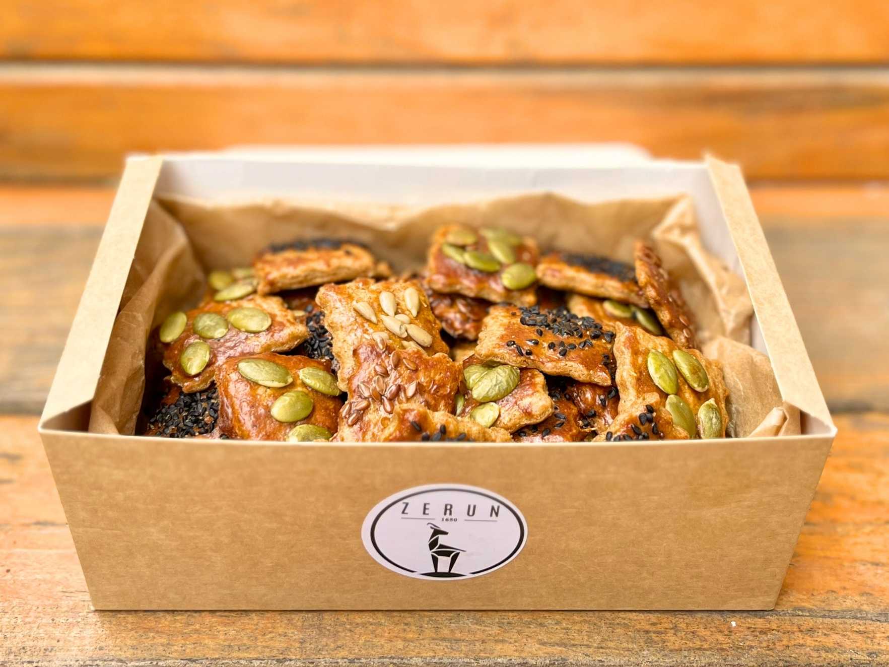 Gelince Haber Ver%100 tam siyez unu ile hazırladığımız; üzerinde çörek otu, ay çekirdeği, kabak çekirdeği ve keten tohumu bulunan tuzlu kurabiyelerimizi web sitemizde 250 gram olarak sunuyoruz.